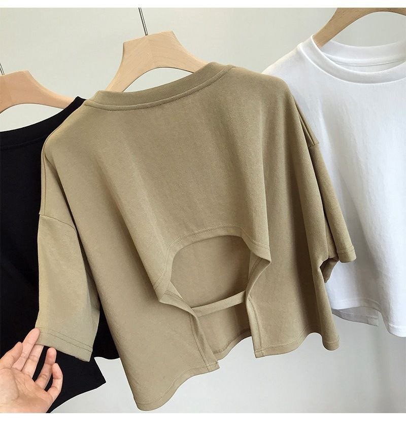 T-shirt court dos nu pour femmes, version coréenne douce et épicée, nouveau style d'été col rond, haut ample à manches courtes pour filles