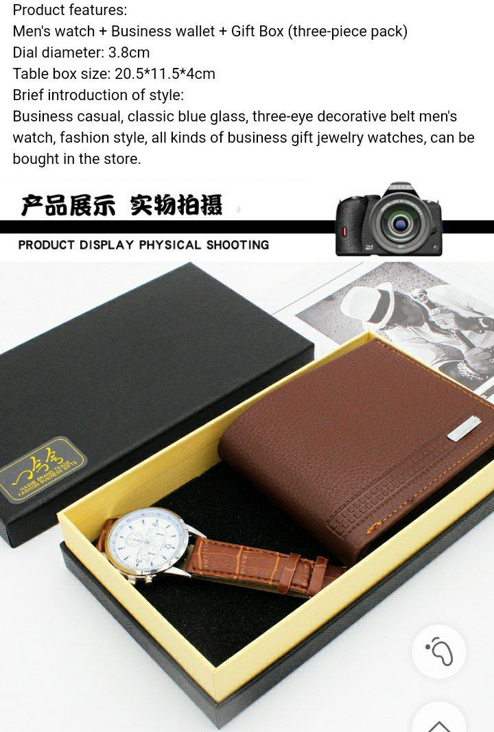 Ensemble cadeau comprenant une montre-bracelet et un portefeuille marron en cuir texturé, présentés dans un coffret noir.