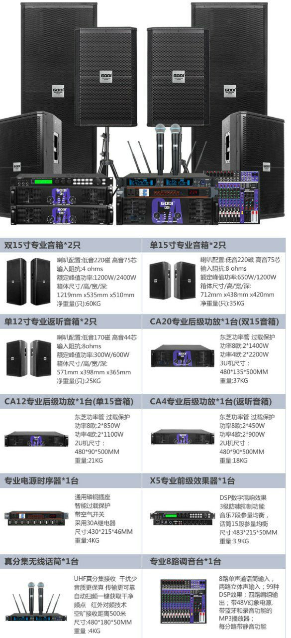 Il comprend plusieurs types d'enceintes professionnelles (double 15 pouces, simple 15 pouces, et enceintes de retour simple 12 pouces), des amplificateurs de puissance (CA20, CA12, CA4), un séquenceur d'alimentation professionnel, un microphone sans fil à vraie diversité, un processeur d'effets professionnel (X5), et une table de mixage professionnelle à 8 canaux.
