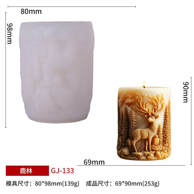Moule en silicone pour fabriquer des bougies cylindriques sur le thème de Noël, représentant un cerf dans une forêt.