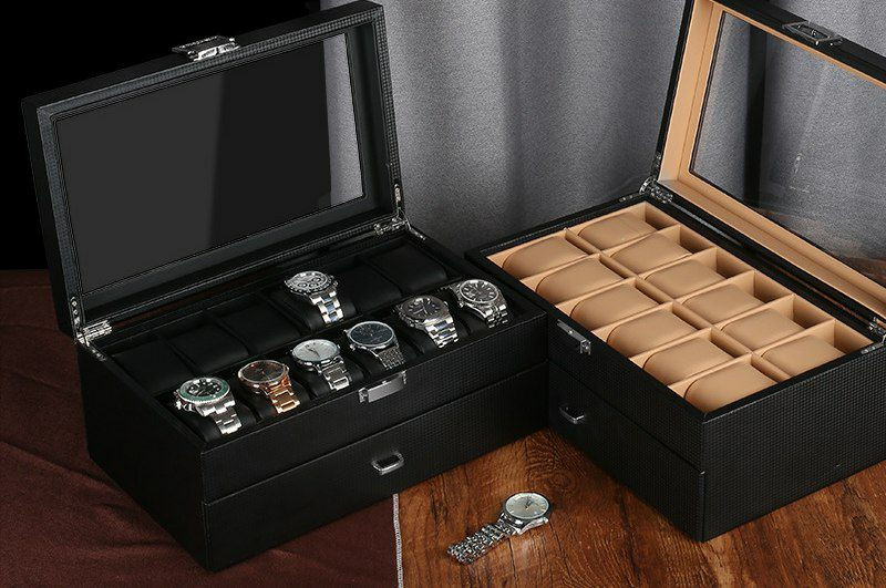 Double couche pu 24 bits boîte de rangement de montre boîte à bijoux en fibre de carbone boîte d'affichage de bracelet boîte-cadeau bracelet